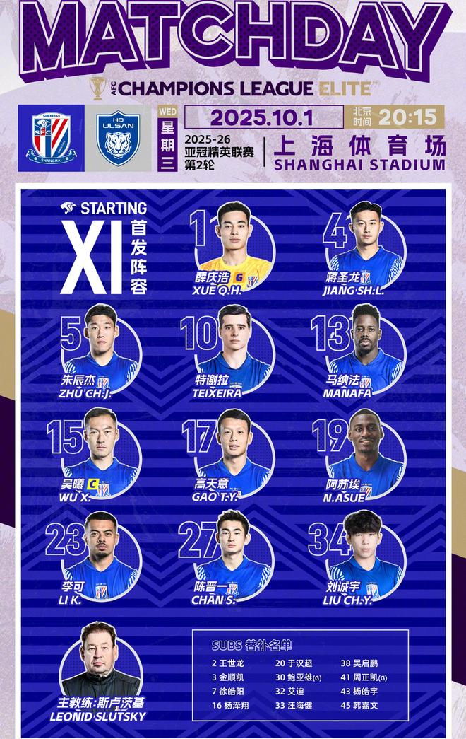 10月1日晚,在2025/26赛季亚冠精英联赛第2轮中,中超豪门上海申花坐镇主场上海体育场,迎战韩国K联赛劲旅蔚山HD。赛前,两队首发名单公布。
