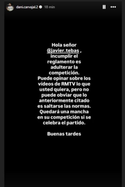 “您好,哈维尔·特巴斯先生。违反规则就是破坏联赛公正性。您可以对皇马电视台的视频内容随意发表看法,但无法否认上述行为已触犯规则。若这场比赛(西甲海外赛)最终举办,将为您的联赛留下污点。下午好。”皇马队长卡瓦哈尔在INS上发布了这则背景为黑色的简短声明,言辞直指西甲联盟主席哈维尔·特巴斯。
